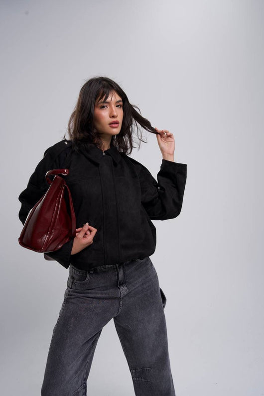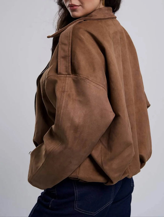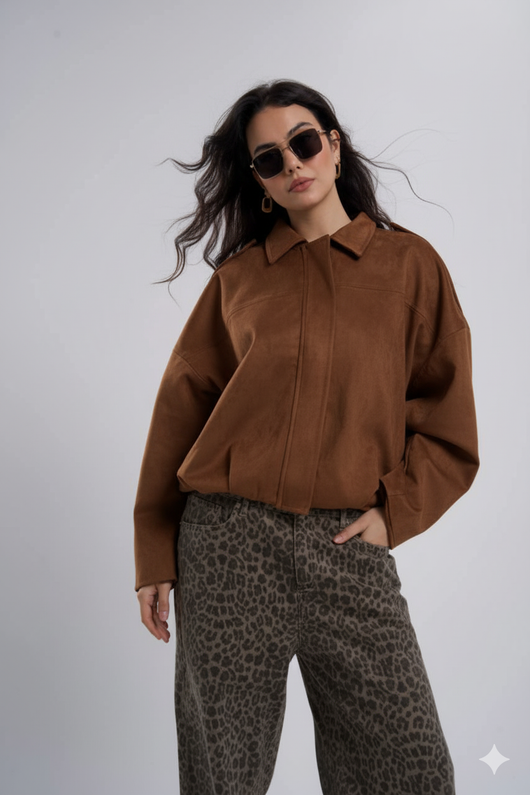• الخامة: Suede مستورد ناعم وفاخر (ملمس الشمواه) بيدي فخامة وثقل. • القصة: تصميم الـ Oversized الأنيق والمريح، بيلبس لحد 85 كجم بستايل مظبوط ومبهر. • اللمسات: سوستة معدنية قوية وعالية الجودة، وياقة عصرية تقدري تلبسيها بأكتر من طريقة.